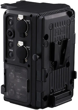 The Canon EU-V2 Expansion Unit 2 is an add-on accessory for select Canon cinema cameras like the C500 Mark II and C300 Mark III that adds a V-Mount plate, Genlock out, dual XLR inputs, & an Ethernet port. Key features include: