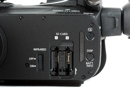 Other Notable Features. Dual SD card slots keep you shooting longer without stopping to swap cards and offer simultaneous dual recording. The camera has two options for viewing your image with a flip-out, 3-inch, capacitive-touch LCD and a compact, extendable rear viewfinder. The camcorder has 4 available channels of audio recorded as linear PCM with two of those those providing phantom power through XLR connectors on the top handle.