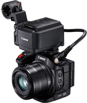 Capture Professional Audio. The XC15 uses the MA400 shoe-mounted XLR adapter, which adds two phantom-powered XLRs, line/mic level switching, and physical gain controls. This configuration is similar to that of the higher-end Cinema EOS cameras.