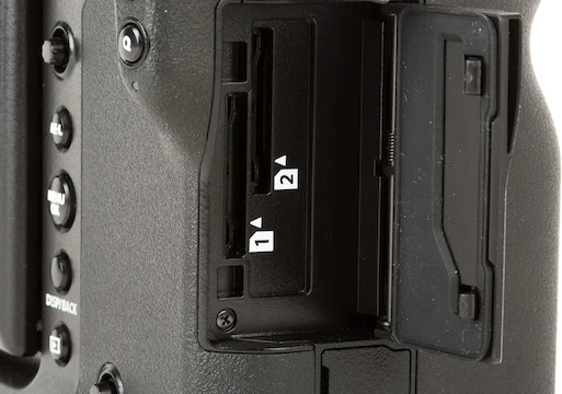 Durable Build. The GFX 100 features a weather- and dust-resistant build, operating in temperatures as low as 14º Fahrenheit. The camera has dual card slots that support UHS-II memory, and the two included rechargeable are rated for an estimated 800 shots per charge.