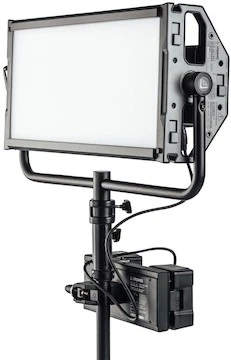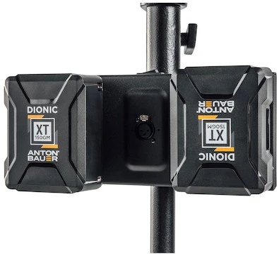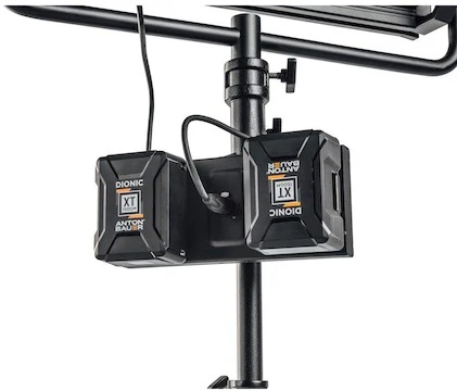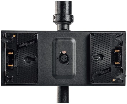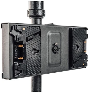 Portability. The Litepanels Dual Gold Mount Battery Bracket mounts on light stands or yokes for greater on-set versatility.