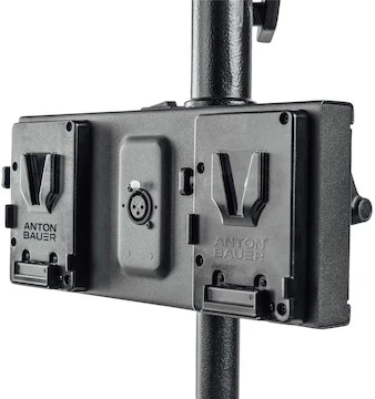 Portability. The Litepanels Dual V-Mount Battery Bracket mounts on light stands or yokes for greater on-set versatility.