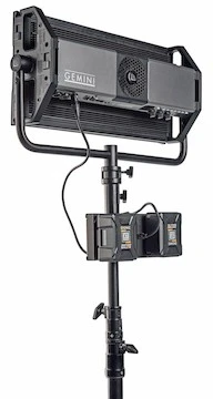 The Litepanels Dual V-Mount Battery Bracket for Gemini accepts two 14.4V broadcast camera batteries that let the to run at 100% power. Key features include: