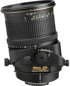 Total Perspective Control. The Nikon 45mm f/2.8D ED PC-E features 8.5° tilt, 11.5mm shift, and 90° rotation capabilities, allowing complete perspective control.