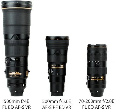 Compact, Lightweight Super Telephoto Prime. The 500mm f/5.6E AF-S PF ED VR is Nikon’s lightest and most compact 500mm super tele, making it a very capable travel-friendly lens. It’s just over 9.0 inches long and weighs a mere 3.2 lbs. Its focal range and constant f/5.6 aperture make it well-suited for daytime sports, wildlife, and action photography.
