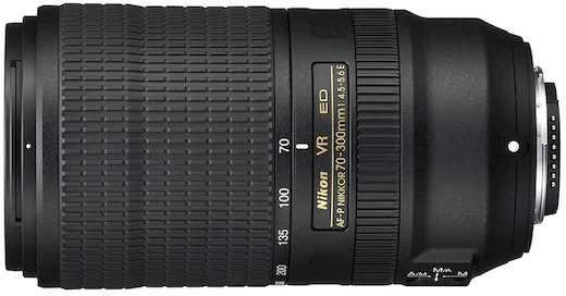 Telephoto Focal Length. The Nikon 70-300mm f/4.5-5.6E ED AF-P VR’s focal length makes it an excellent choice for shooting long-range sports and wildlife with an FX-format camera. Its f/4.5-5.6 aperture is plenty fast for daytime use, but you probably won’t want to shoot too much in low light with this one. The 70-300 is also compatible with DX-format DSLRs, on which it’ll provide a 105-450mm equivalent zoom range.