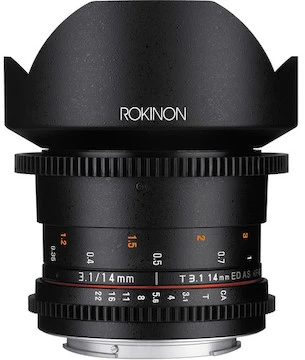 Ultra-Wide Angle Prime. The Rokinon 14mm T3.1 Cine DS offers full-frame coverage while providing a 115.7° angle of view, giving you a budget-friendly, ultra-wide angle cine lens. Its T3.1 aperture is relatively fast for shooting in moderately low light, but you’re probably not picking an ultra-wide for low-light shooting.
