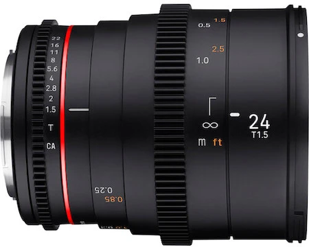 The Rokinon 24mm T1.5 Cine DSX is a fully manual wide-angle cine prime designed for Canon RF-mount cameras. Key features include: