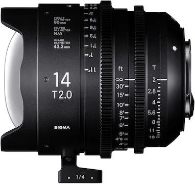 Wide-Angle Prime. The Sigma Cine 14mm T2.0 offers full-frame coverage, giving you a compact, lightweight, wide-angle cine lens. It’s capable of delivering 6K to 8K resolution, and its fast T2.0 aperture allows depth-of-field control and low-light shooting flexibility.