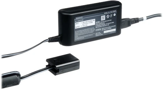 The Sony AC-PW20 adapter provides AC power to various Sony E-mount cameras that use the NP-FW50 battery. Key features include: