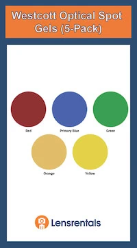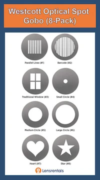 Interchangeable Gobos and Gels. Included with the Optical Spot are several swappable gobos for creative lighting effects and gels to adjust the color of your scene. More gobo and gel packs are available to rent separately for a wide variety of options. These are compatible with non-bulb-based strobes up to 600Ws and 100W COBs.